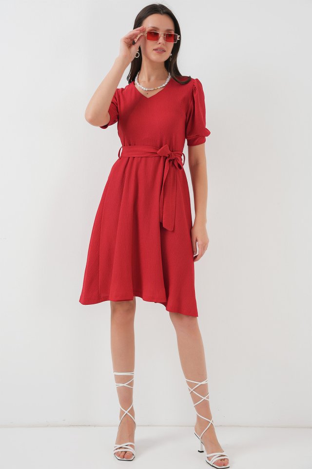 2370 Kuşaklı Örme Elbise - Kırmızı