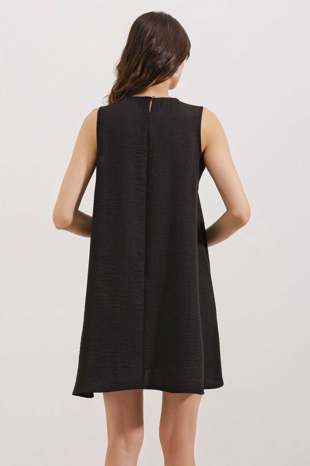 2444 Detaylı Mini Keten Elbise - Siyah