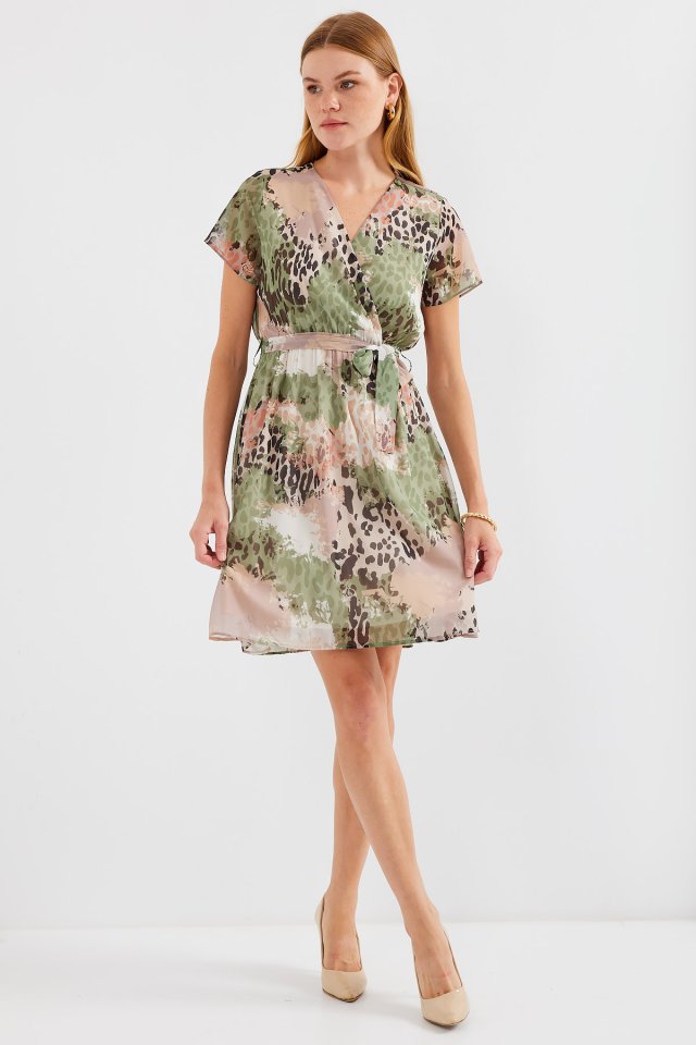 2502 Kısa Kol Desenli Şifon Elbise - Çağla