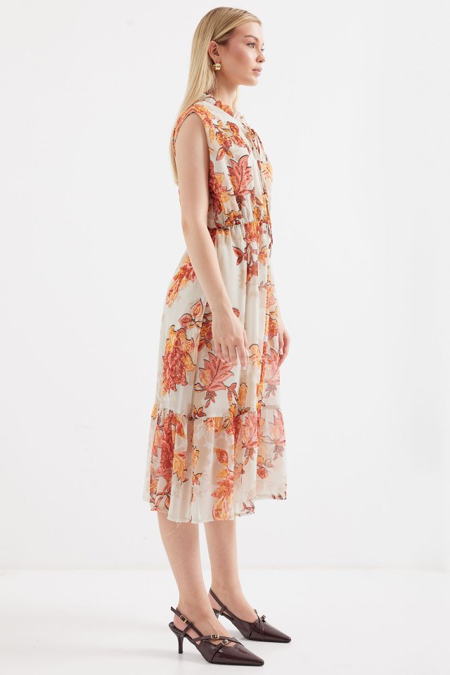 2503 Desenli Sıfır Kol Şifon Elbise - Kiremit