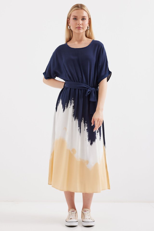 2504 Desenli Kısa Kol Viskon Elbise - Lacivert