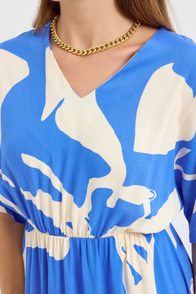 2511 Beli Lastikli Desenli Elbise - Mavi