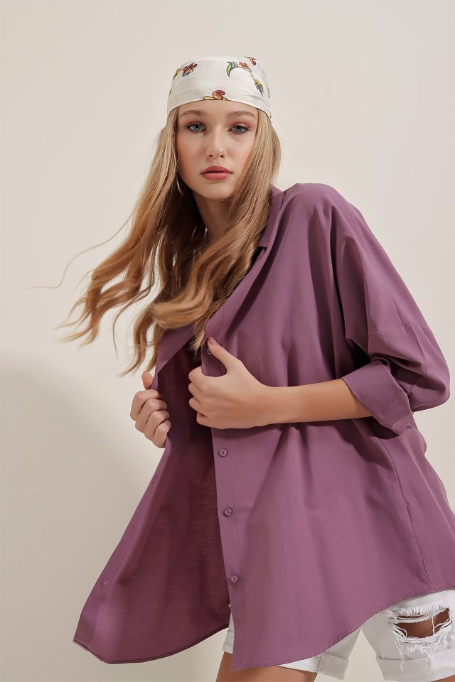 3900 Oversize Uzun Basic Gömlek - Koyu Lila