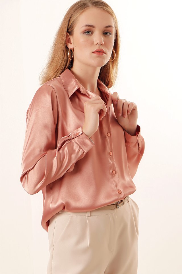 3964 Hafif Dökümlü Saten Gömlek - Camel
