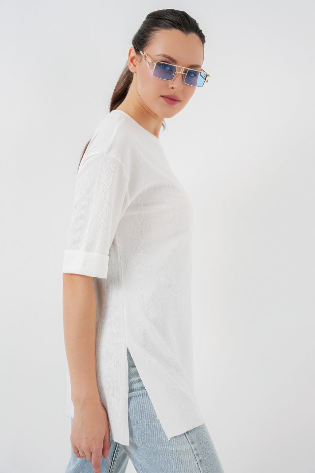 4332 Yanı Yırtmaçlı Örme Tişört - Beyaz