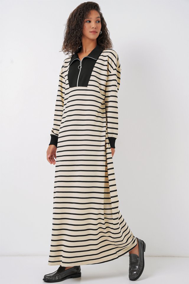 55453 Fermuar Detaylı Çizgili Uzun Elbise - Siyah