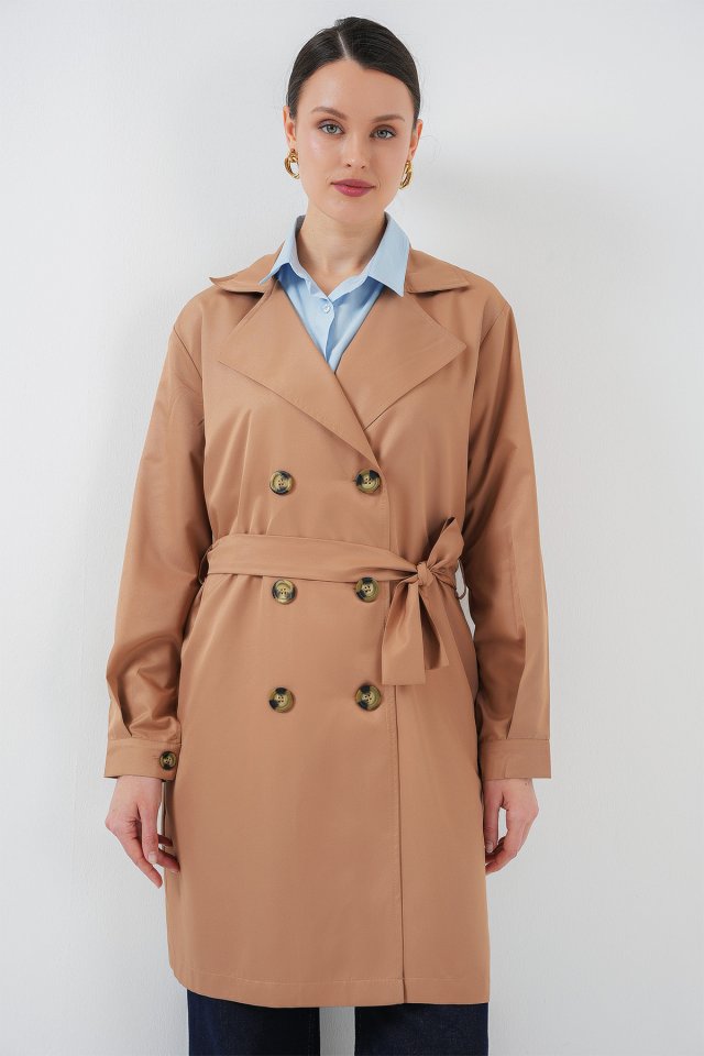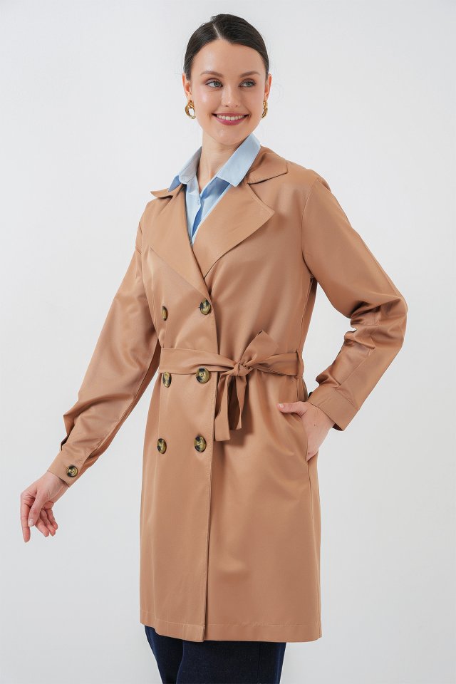 5864 Kruvaze Yaka Kısa Trençkot - Taba