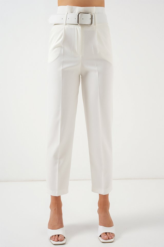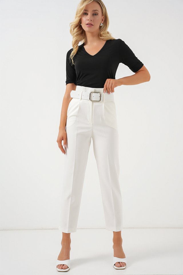 6556 Kemerli Kumaş Pantolon - Ekru