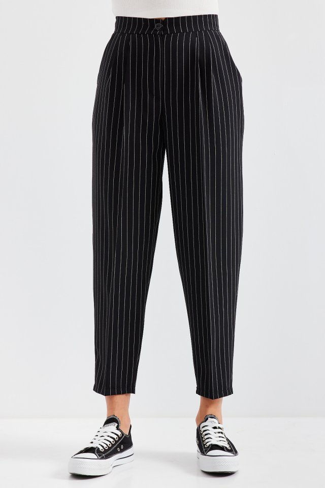 6637 Yüksek Bel Çizgili Kumaş Pantolon - Siyah