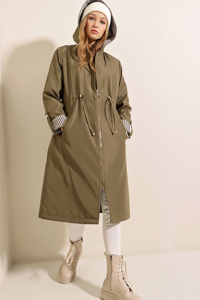 9091 Beli Büzgülü Kapşonlu Trençkot - Haki