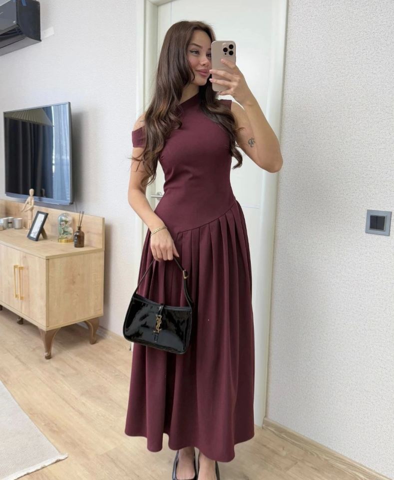 Asimetrik Düşük Yaka Kolsuz Uzun Elbise - Bordo