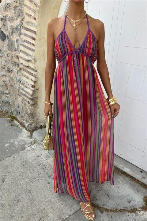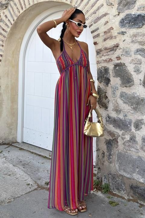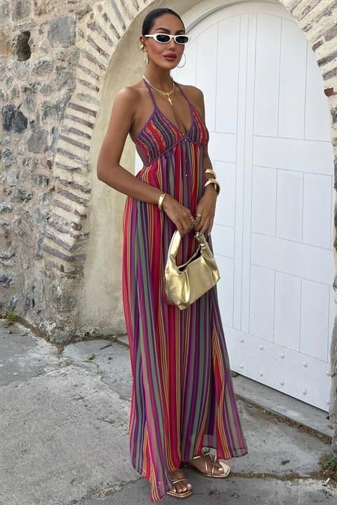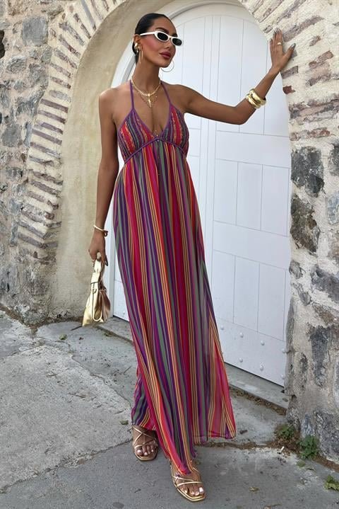 Askılı Pile Detaylı Renkli Maxi Elbise 2748