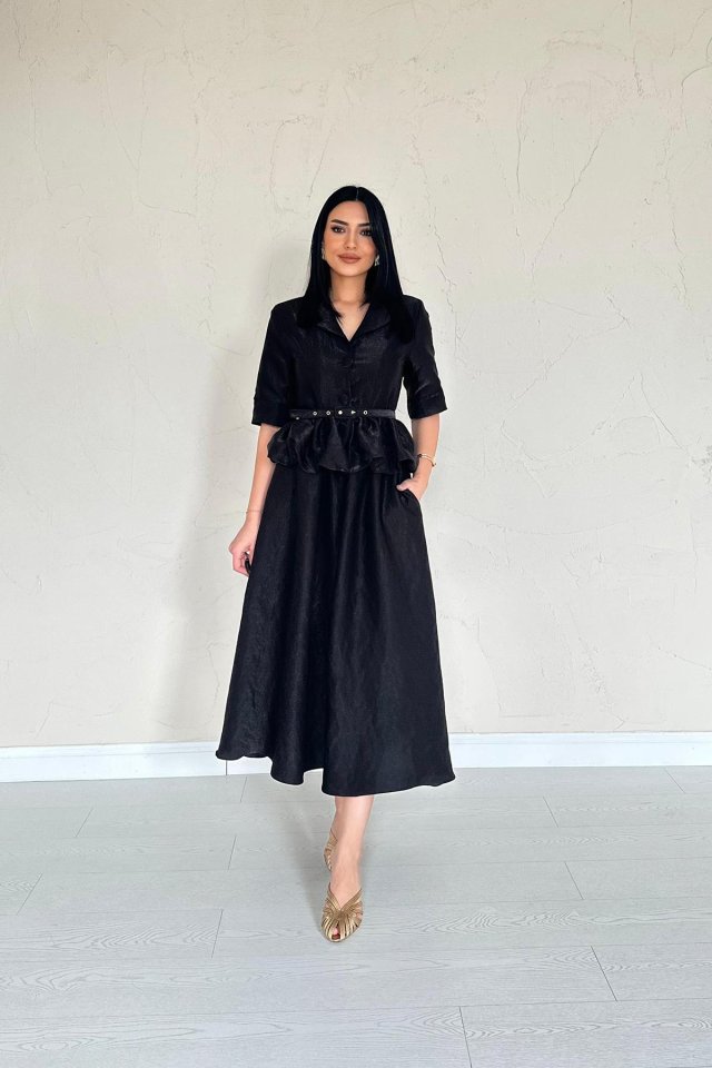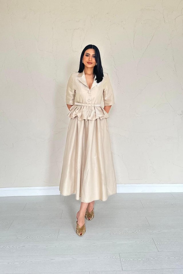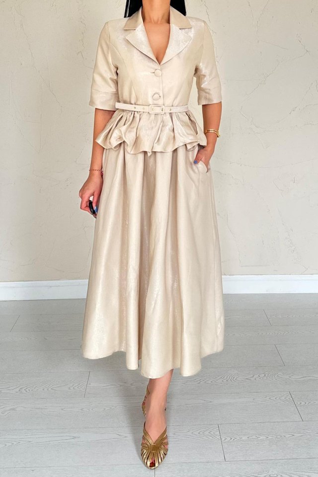 Bej İnce Kemerli Fırfırlı Ceket Ve Büzgülü Etek Takım