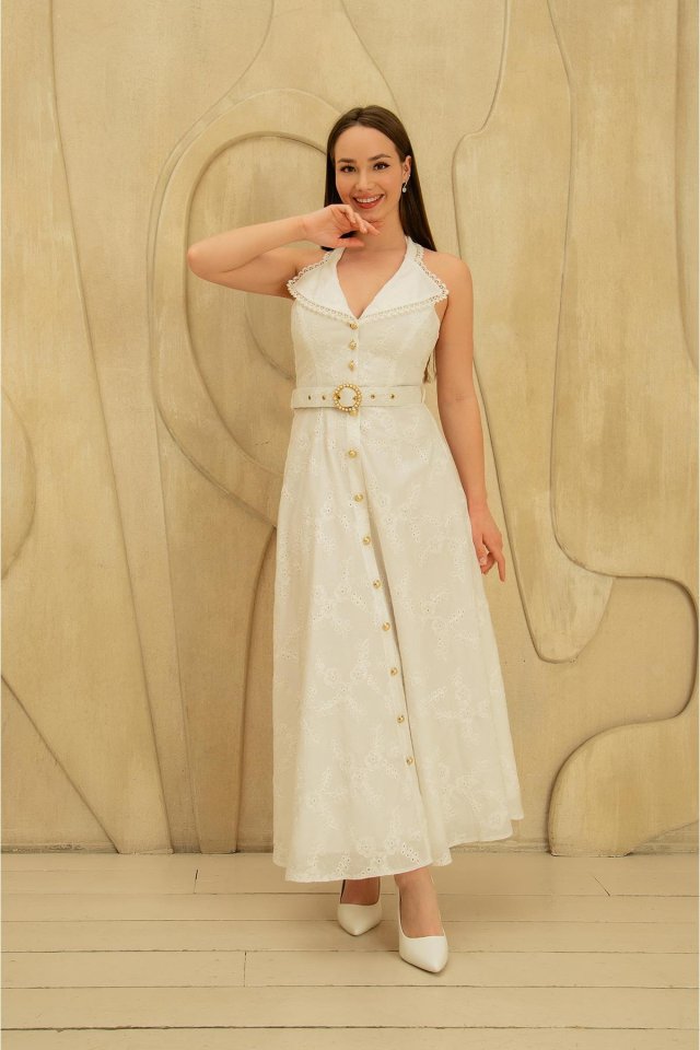 Beyaz İnci Kemer Detaylı Dantelli Elbise