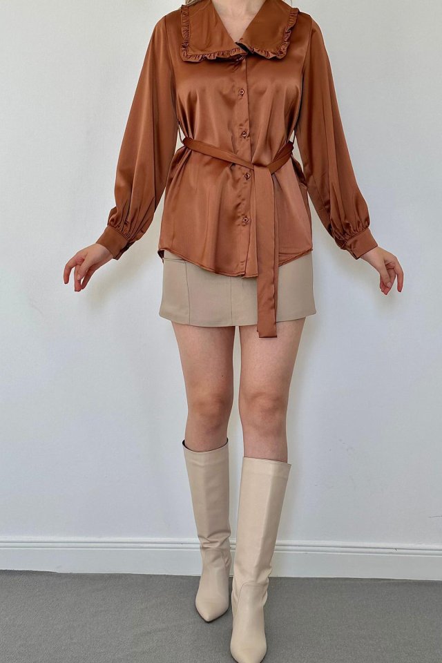 Beyaz Yakası Fırfırlı Kuşaklı Saten Gömlek