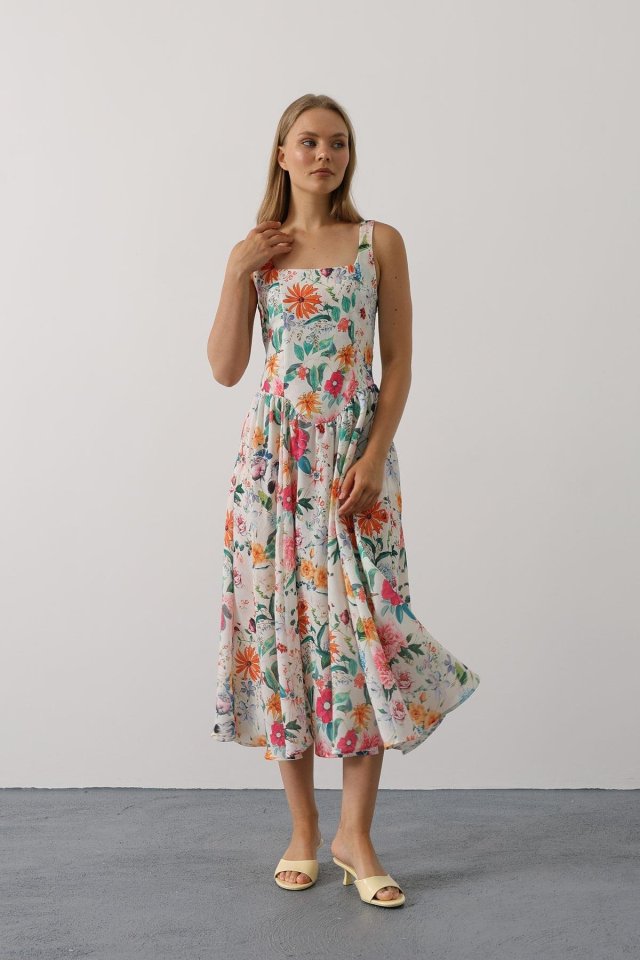 Çiçek Desenli Askılı Elbise - Pembe Çiçek