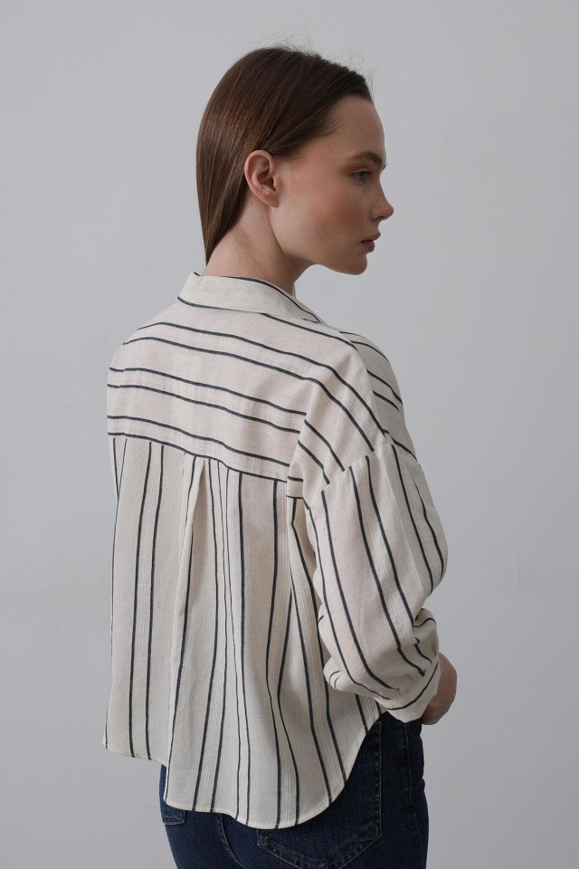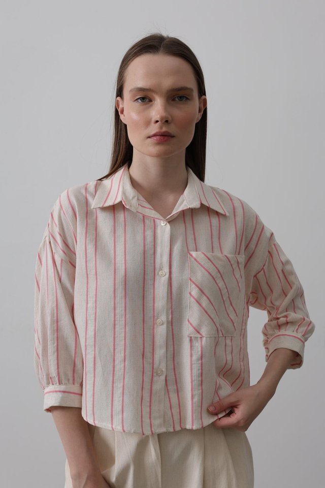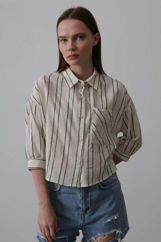 Çizgili Kısa Gömlek - Bej-Yeşil