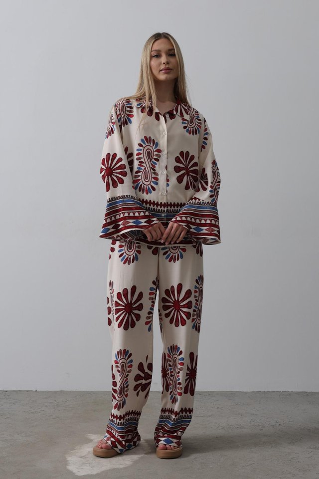 Desenli Kolları Volanlı Pantolon Takım - Antrasit
