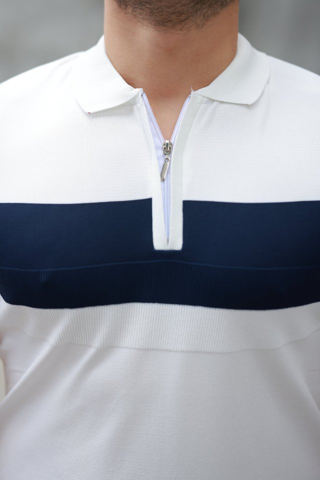 Erkek Fermuar Yakalı şerit Renk Desenli Kısa Kollu Tişört