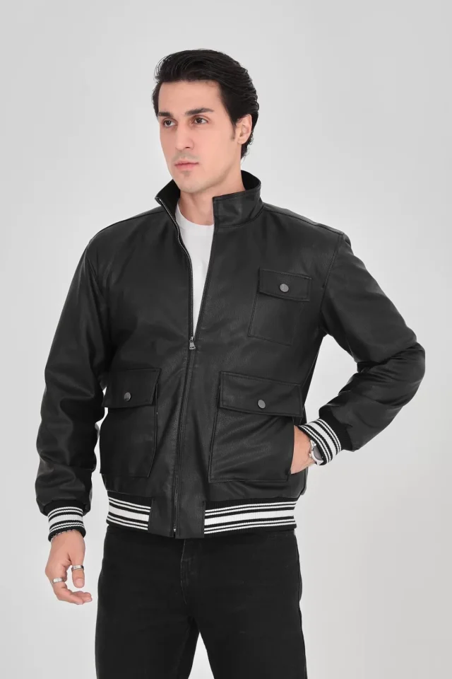 Erkek Fermuarlı İçten Elyaf Ve Astarlı Suni Deri Ceket - Siyah