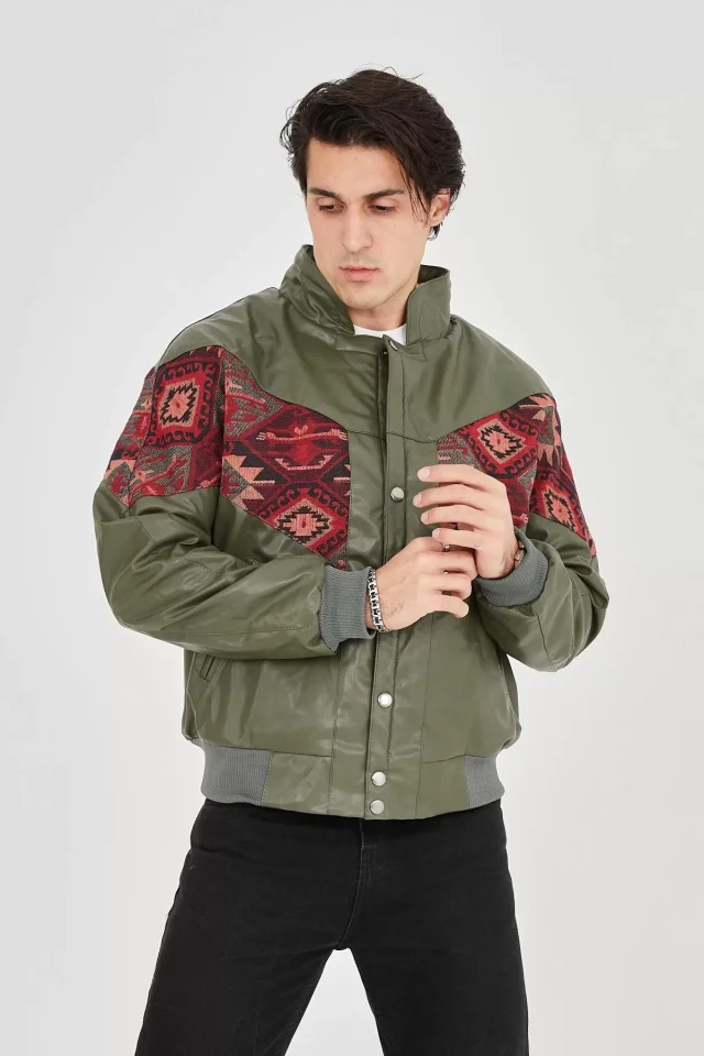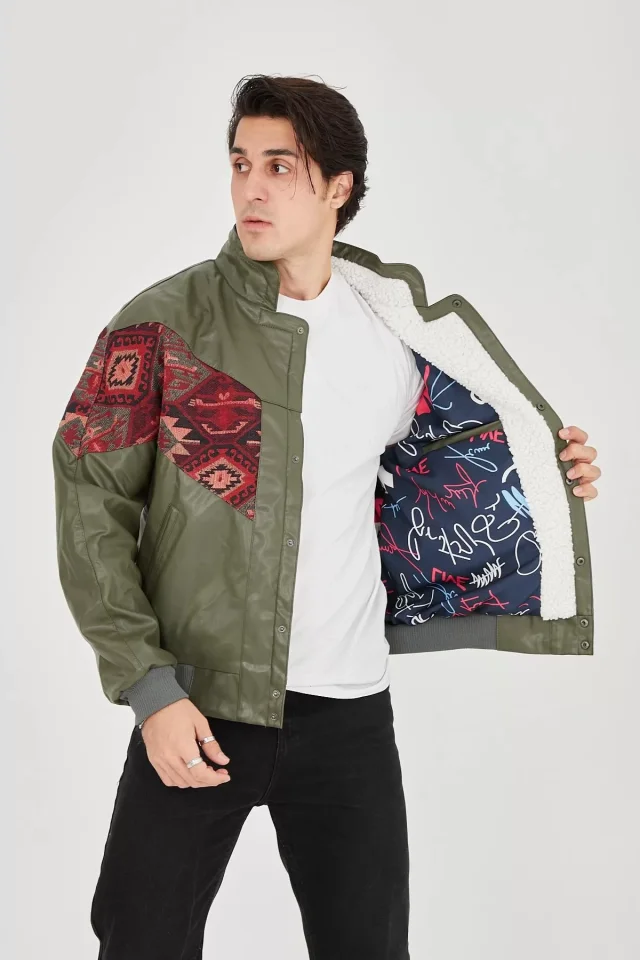 Erkek İçi Astarlı İçten Yaka Kısmı Peluşlu Suni Kumaş Vintage Ceket - Haki