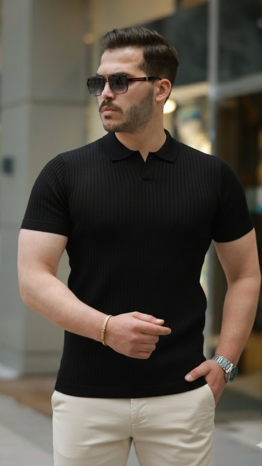 Anasayfa Erkek Erkek Kısa Kollu Yakalı çizgi Desenli Triko Bluz