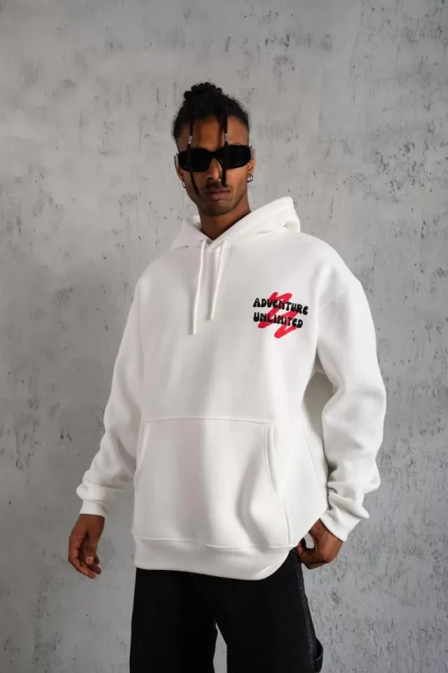Erkek Şapkalı Güvercin Baskılı Kapşonlu Sweat - Beyaz