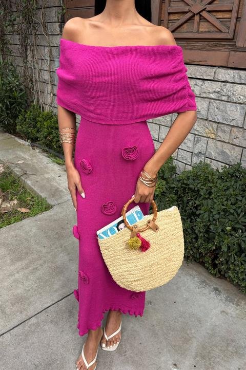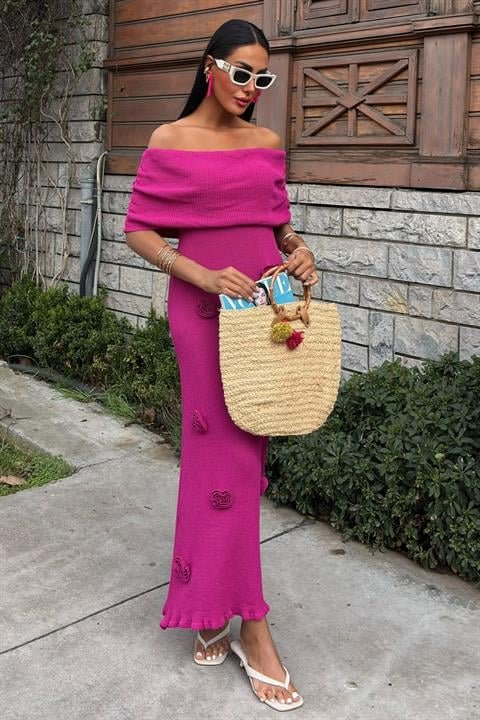 Eteği Gül Detay Madonna Yaka Elbise 2863
