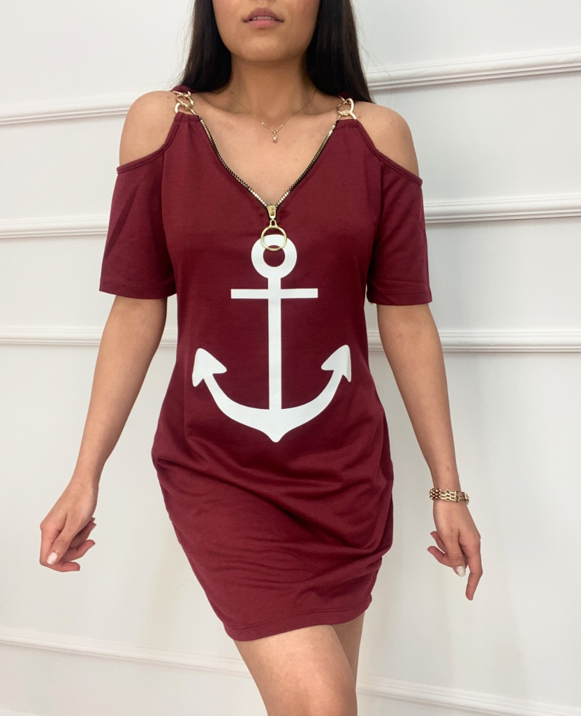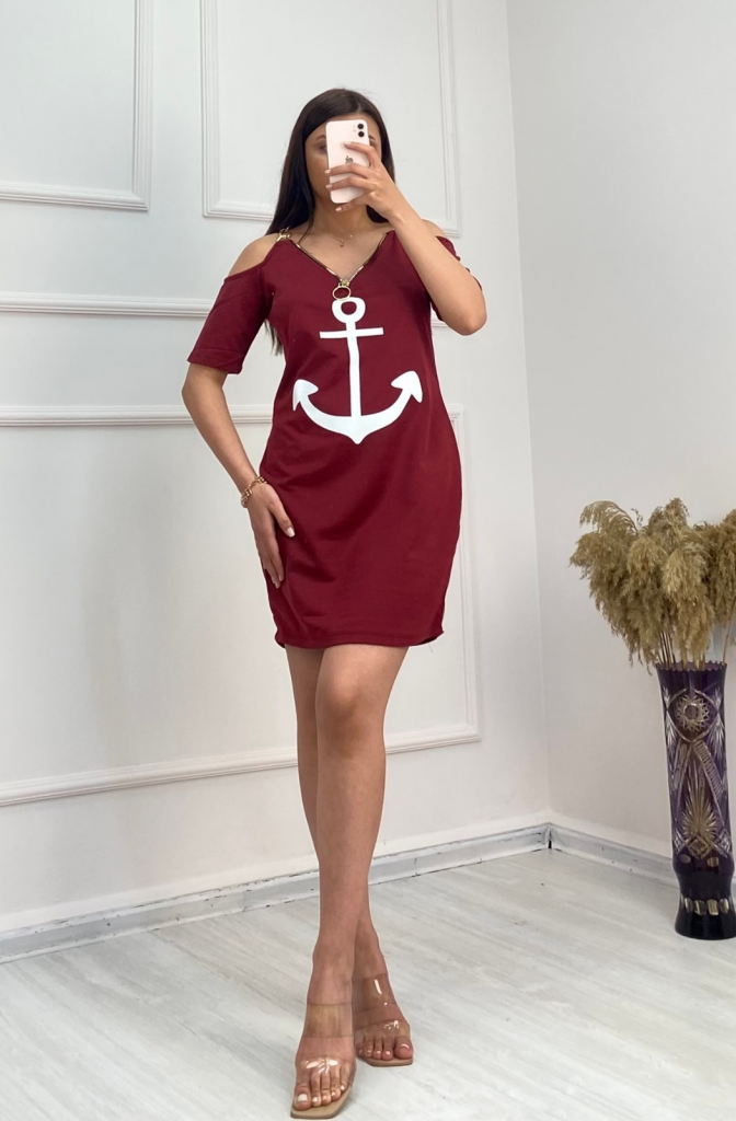 Fermuar Detay çıpa Baskılı Zincir Askılı Iki Iplik Elbise - Bordo