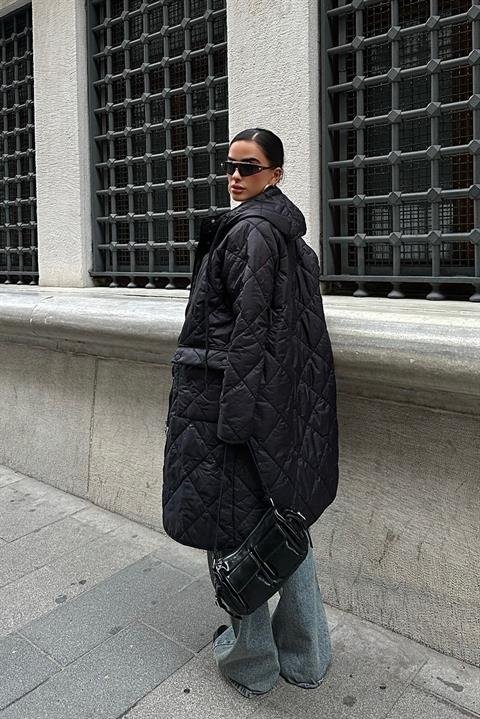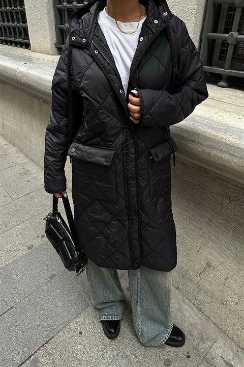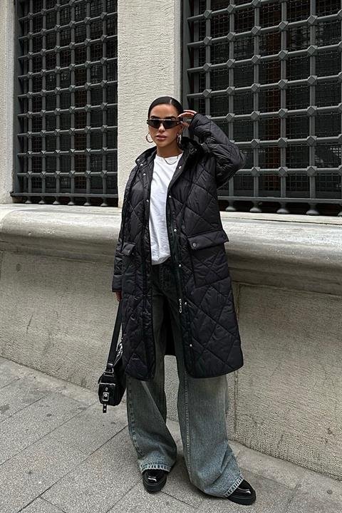 Fermuar Ve Kapşonlu Uzun Kapitone Mont 7062