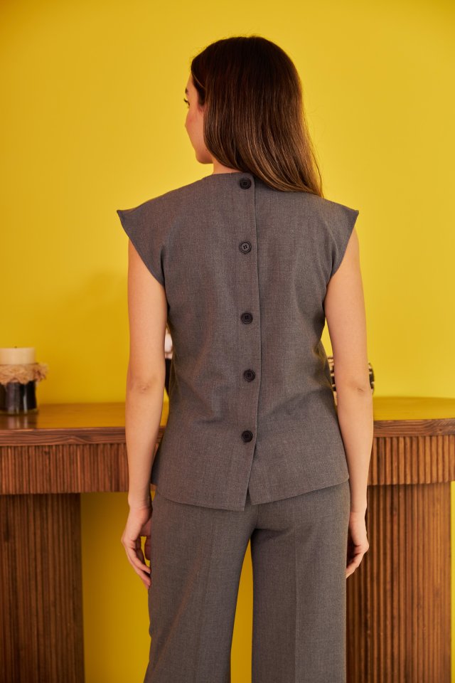 Gri Sıfır Kol Düğmeli Gömlek Takım