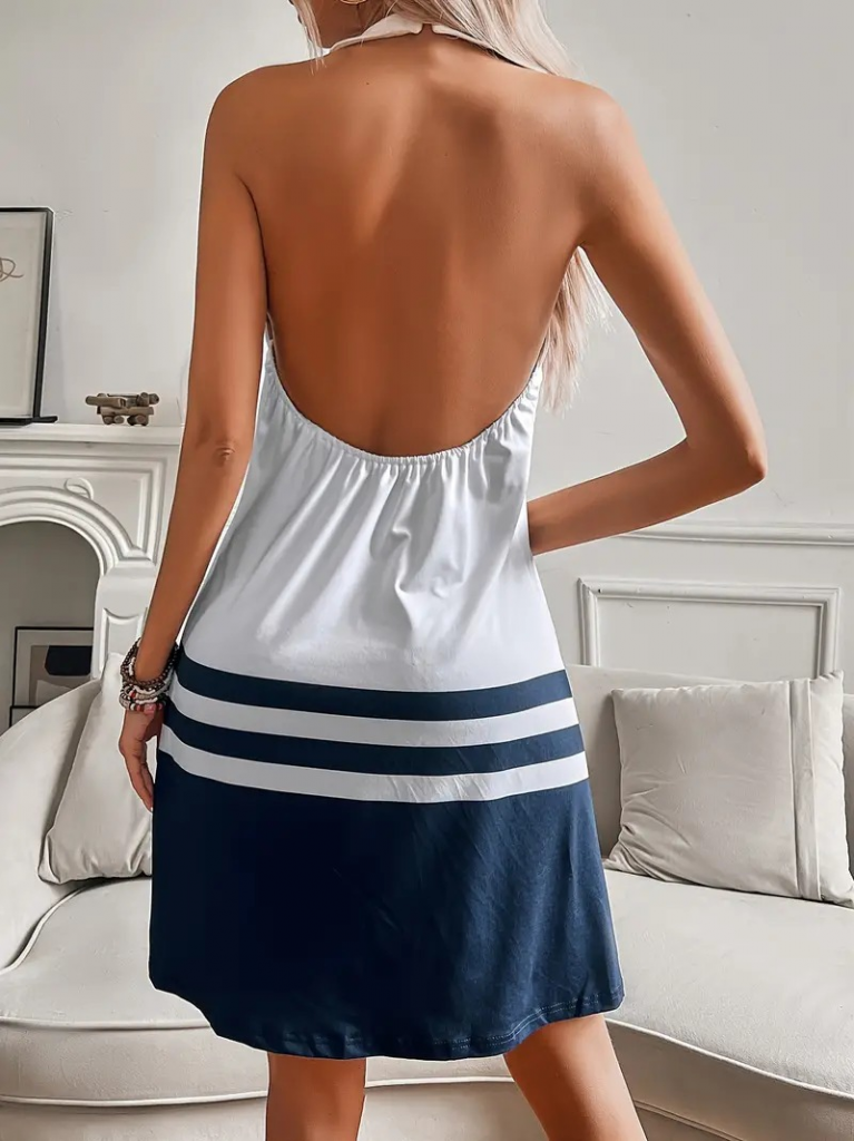 Kadın Askılı çıpa Baskılı Sırtı Açık Kısa Süprem Elbise