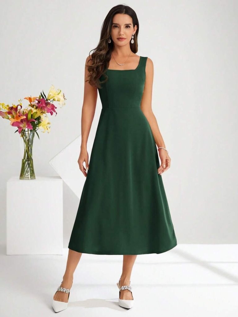 Kadın Askılı Kare Yakalı Midi Ithal Krep Elbise