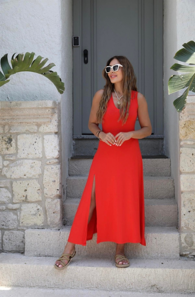Kadın Askılı V Yakalı Yırtmaçlı Viskon Elbise