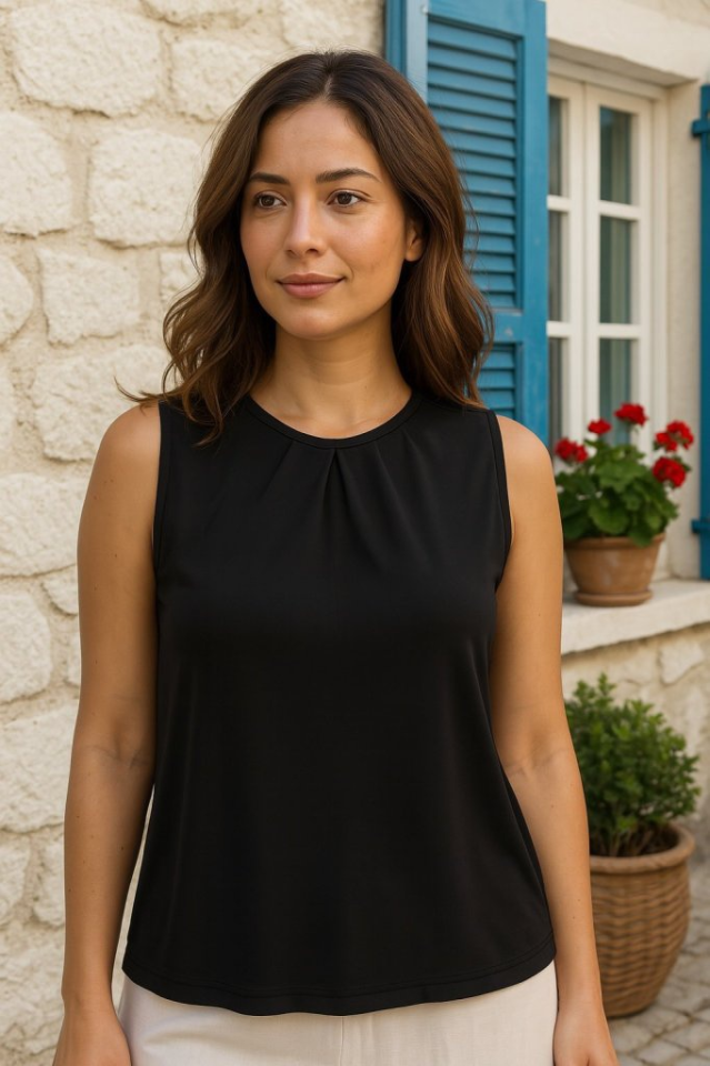 Kadın Askılı Yuvarlak Büzgü Yaka Sandy Bluz