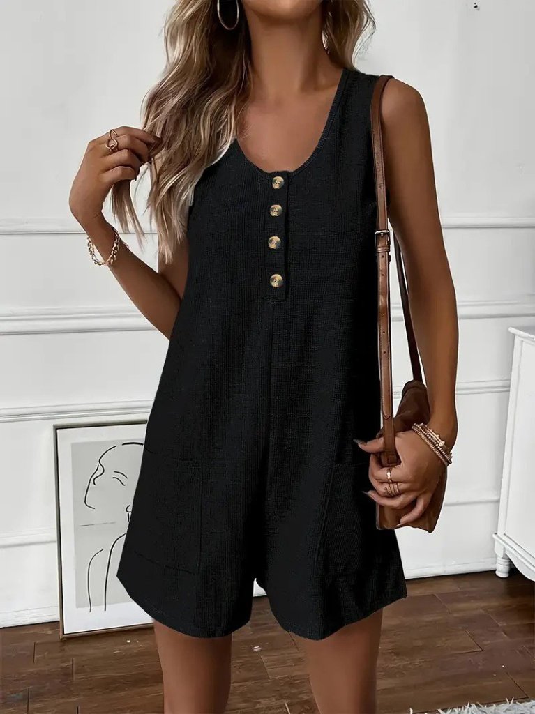 Kadın Askılı Yuvarlak Yaka Düğmeli Waffle Kısa Tulum