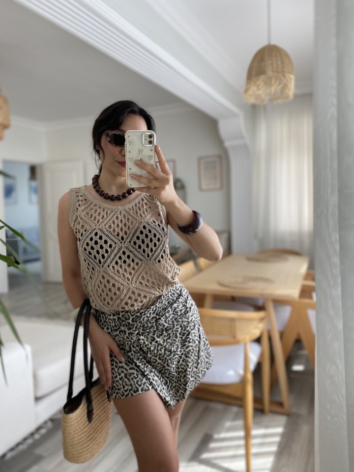 Kadın Askılı Yuvarlak Yaka Geometrik Desenli Triko Bluz