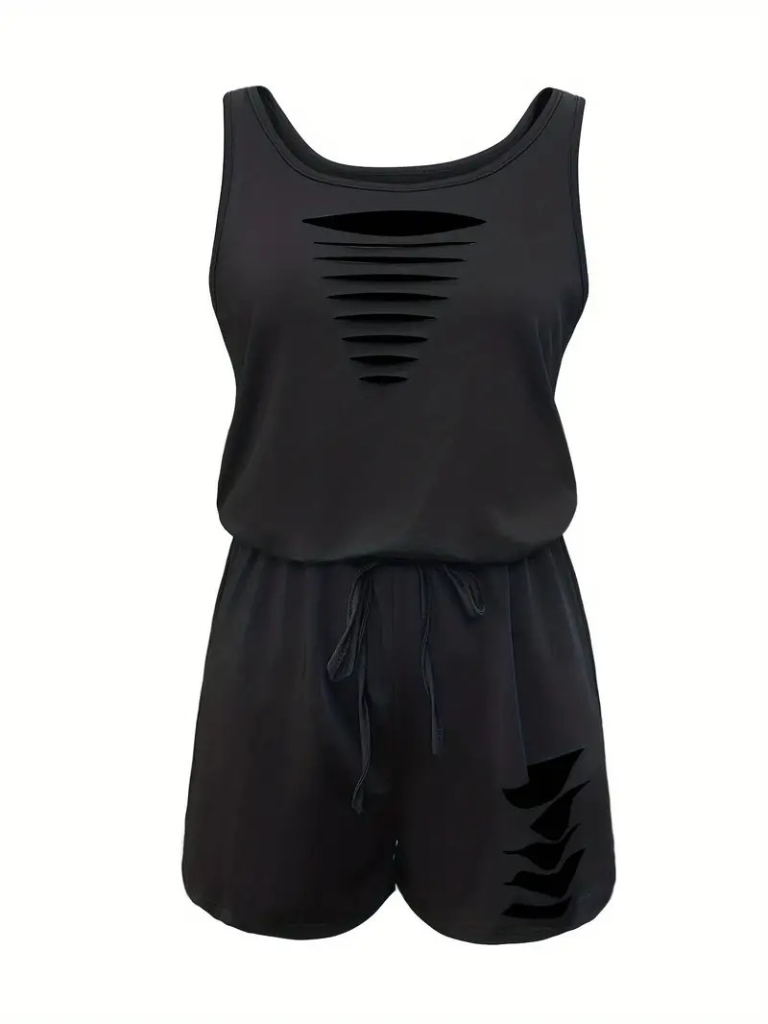 Kadın Askılı Yuvarlak Yaka Lazer Kesim Detaylı Bağcıklı Kısa Viskon Tulum