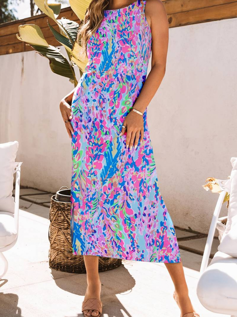Kadın Askılı Yuvarlak Yaka Yandan Yırtmaçlı Uzun Süprem Elbise