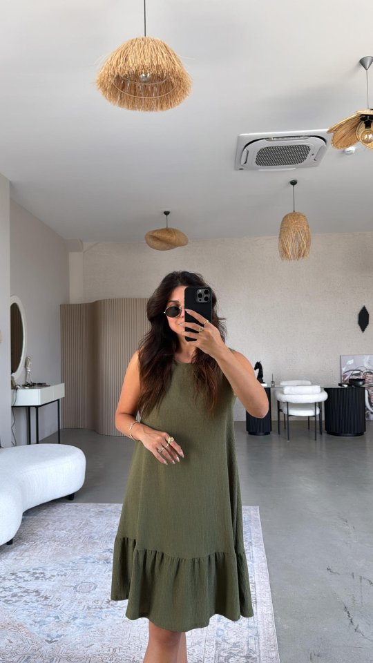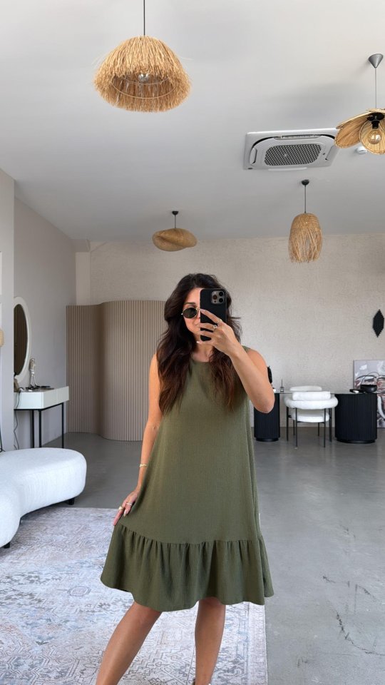 Kadın Bisiklet Yaka Eteği Volanlı Bürümcük Elbise