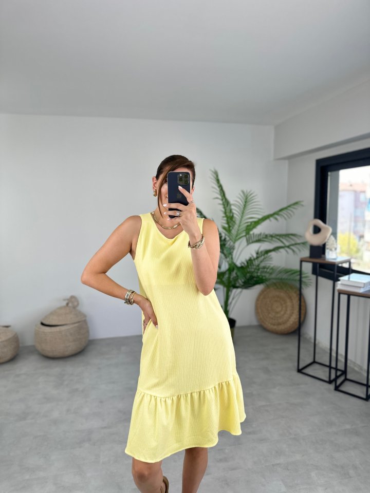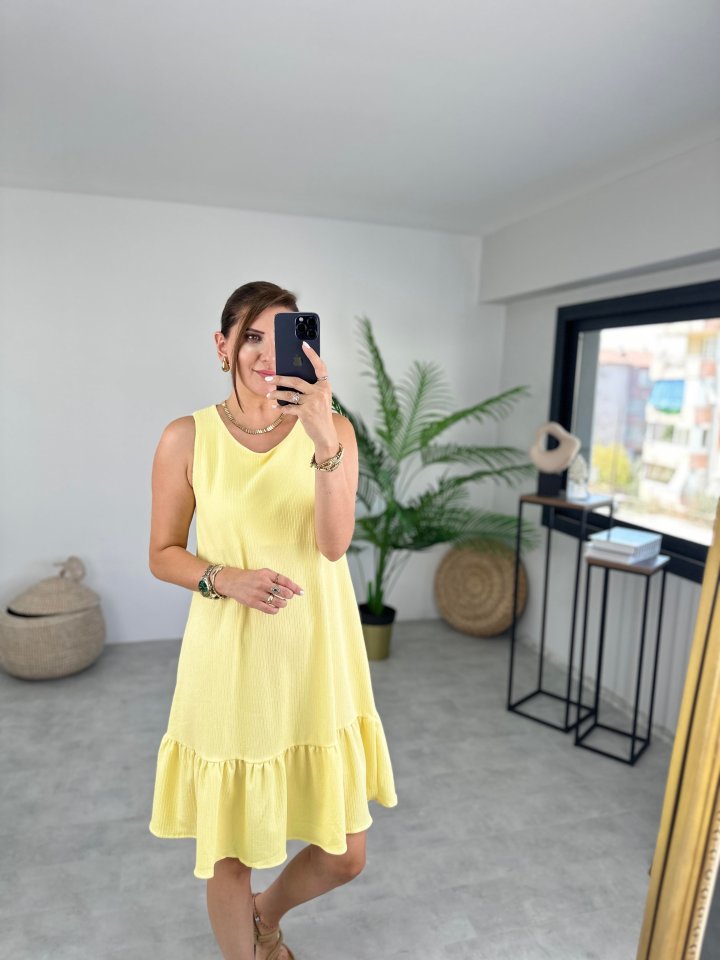 Kadın Bürümcük Kumaş Eteği Fırfır Detaylı Sıfır Kol Elbise