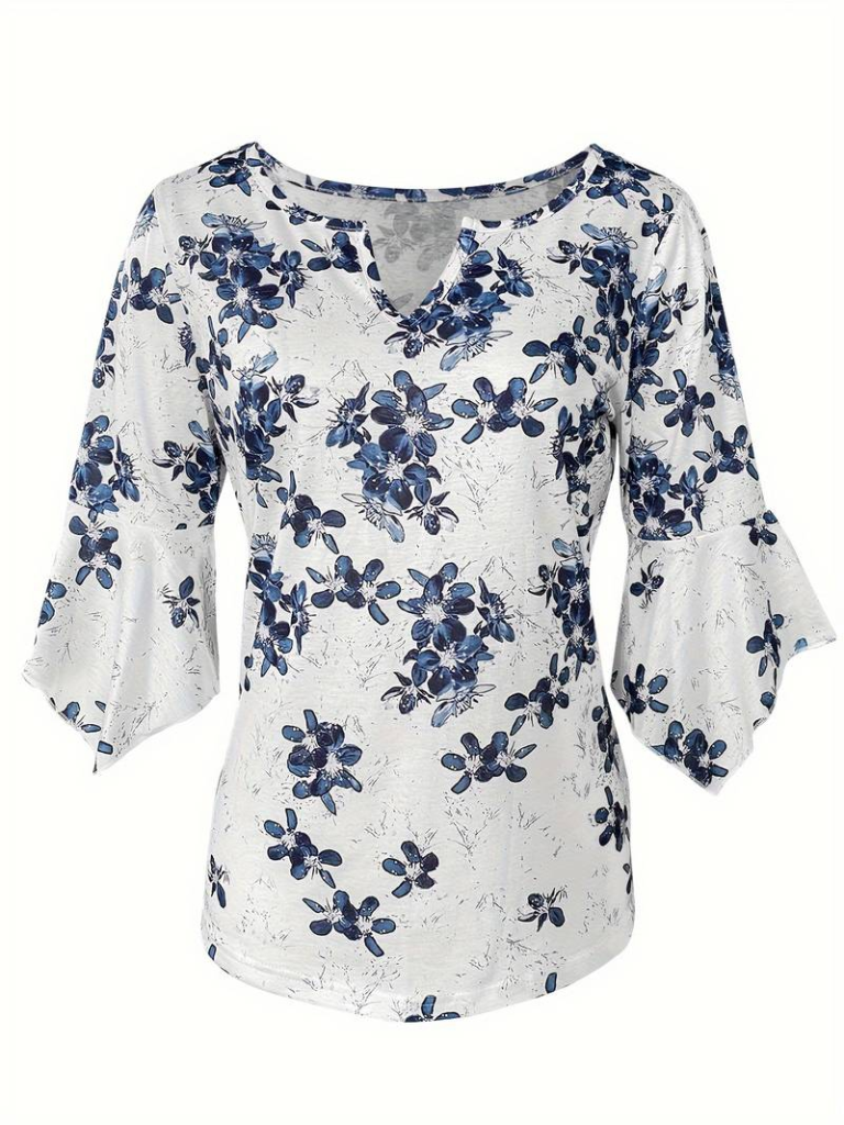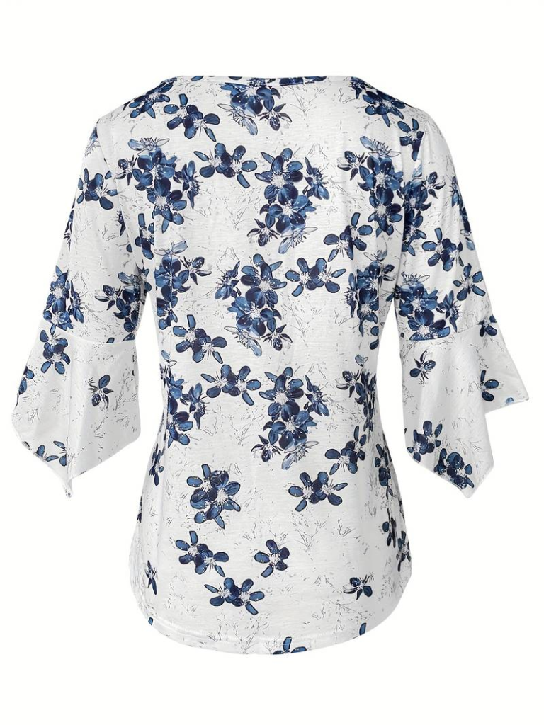 Kadın Fakir Kollu Fırfırlı V Yakalı çiçek Desenli Ithal Keten Bluz