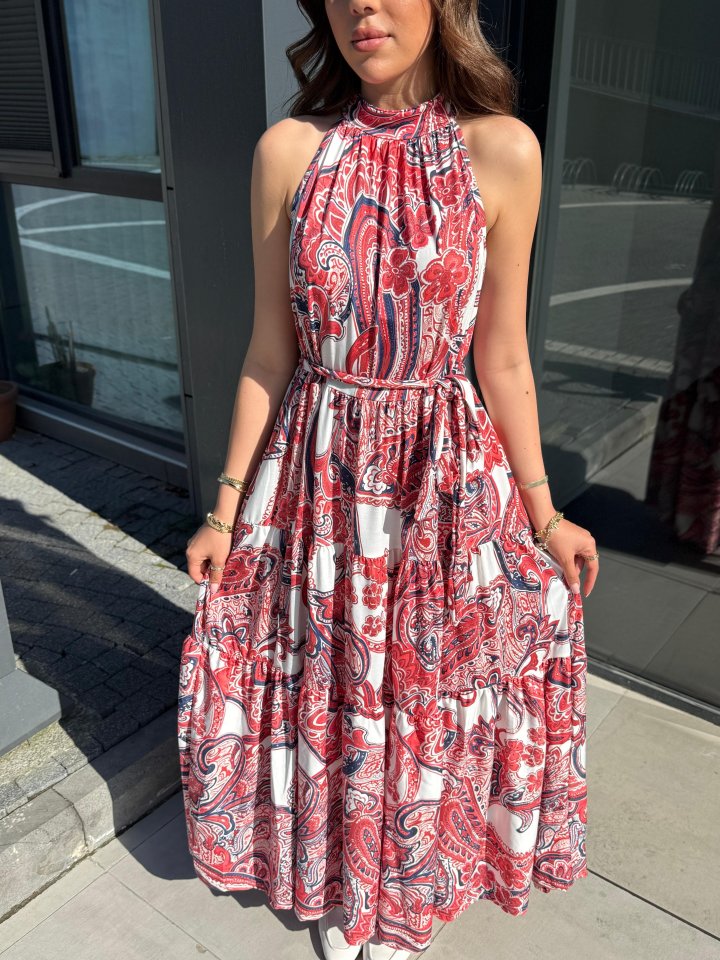 Anasayfa Kadın Kadın Halter Yakalı Omuzlardan Açık Kuşaklı Maksi Boy Desenli Süprem Elbise