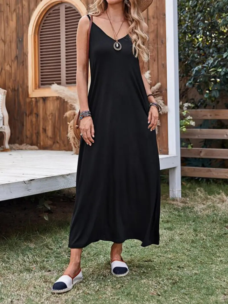 Kadın Ip Askılı Derin Geniş V Yakalı Uzun Viskon Elbise