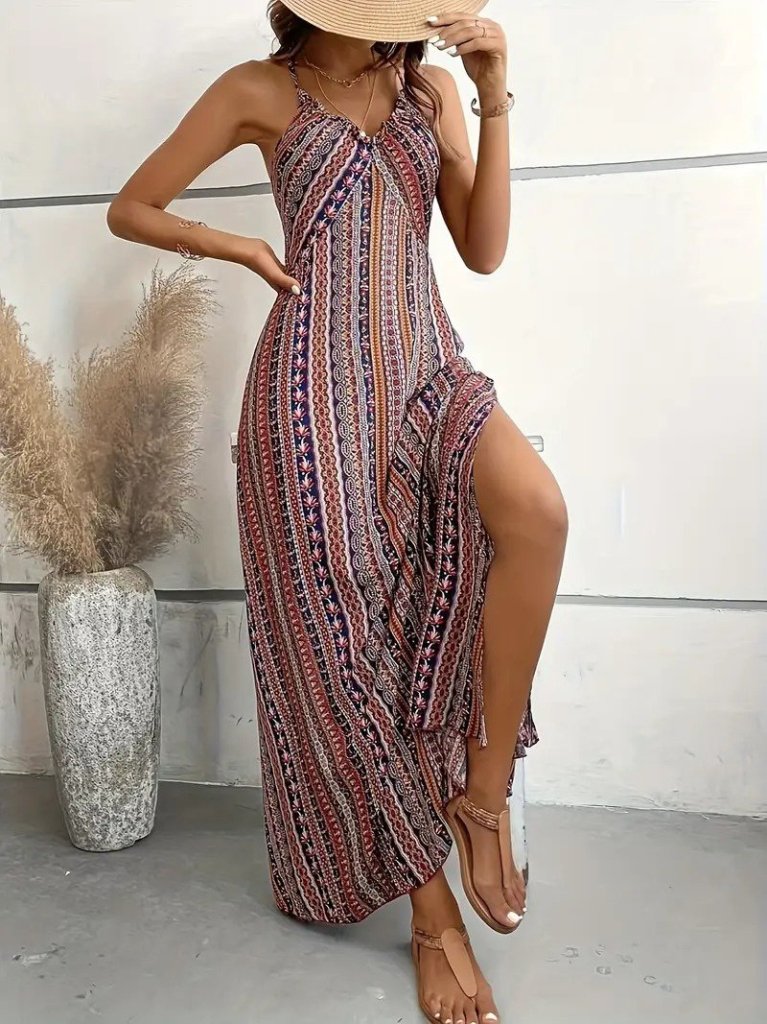 Kadın Ip Askılı Sırttan çapraz Detaylı Yırtmaçlı Desenli Süprem Elbise