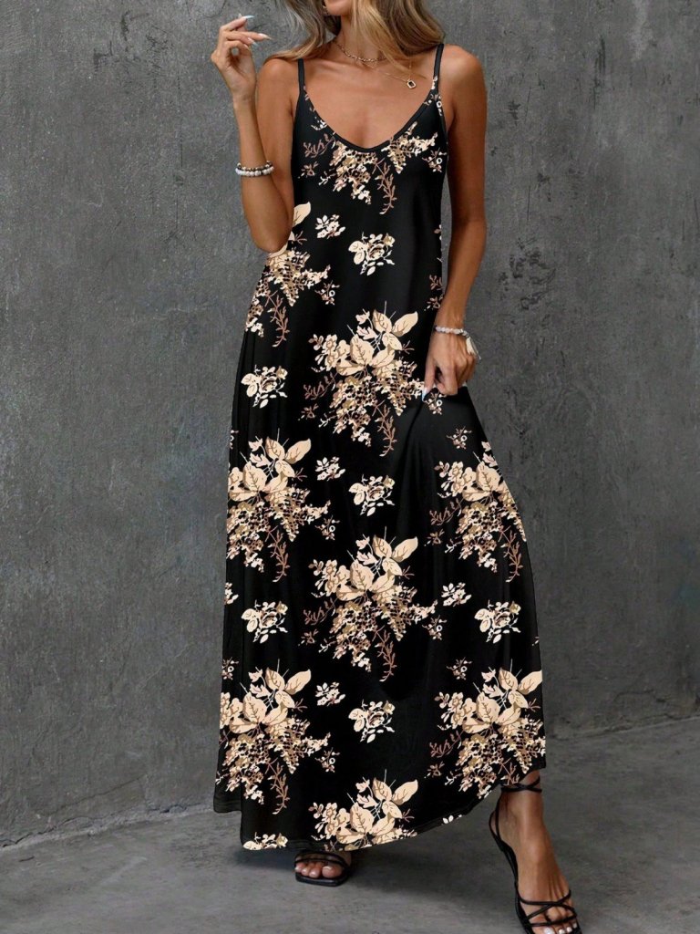 Kadın Ip Askılı V Yakalı çiçek Desenli Süprem Elbise