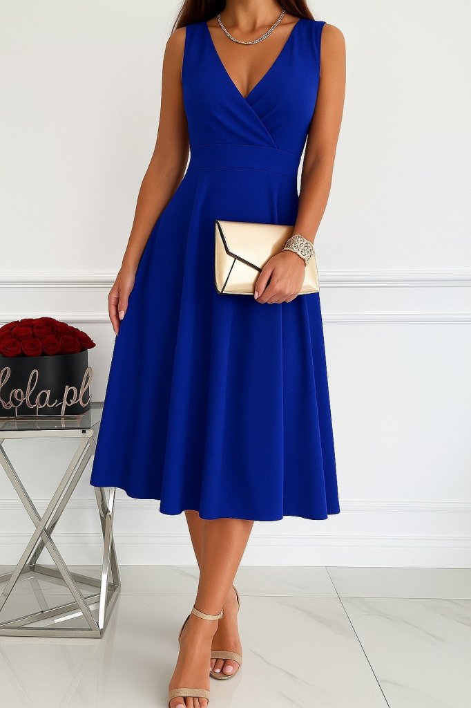 Kadın Ithal Krep Kumaş Kruvaze Yaka Eteği Kloş Kolsuz Mini Elbise