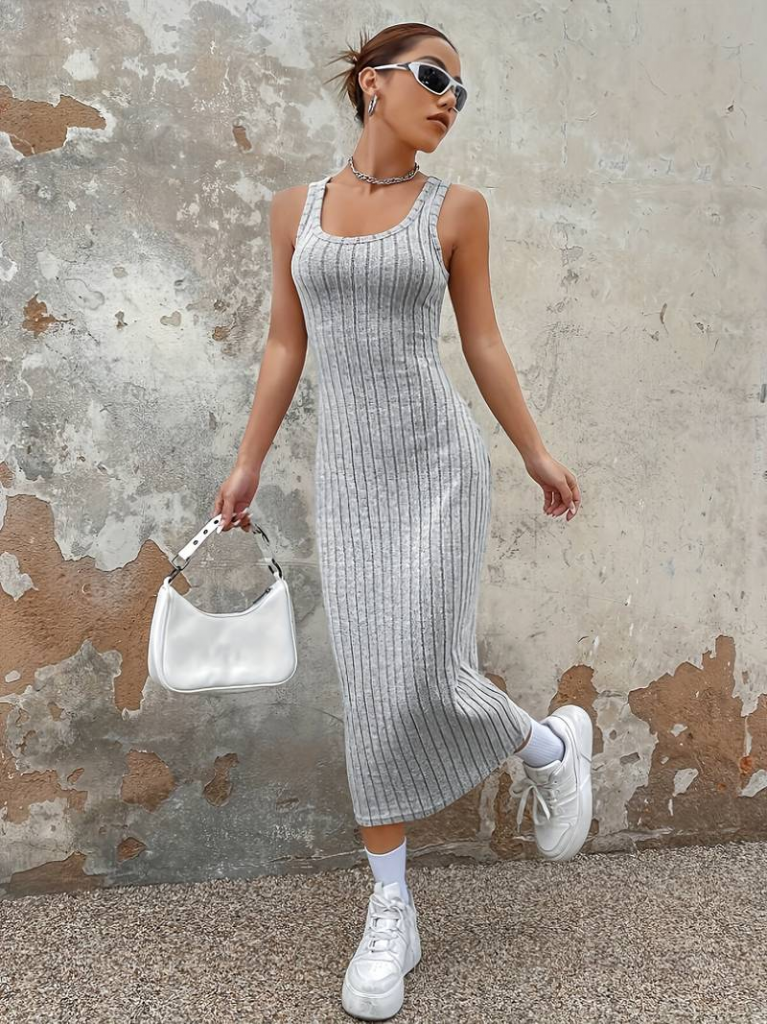 Kadın Kalın Askılı Kare Yaka Fitilli Kaşkorse Midi Boy Elbise