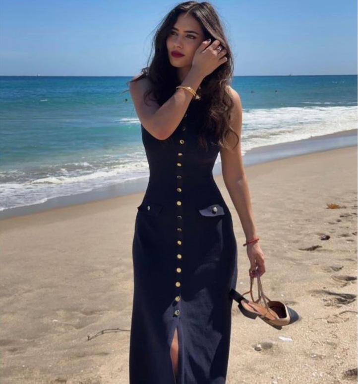 Kadın Kaşkorse Kumaş Düğme Detaylı Kolsuz Maxi Boy Elbise