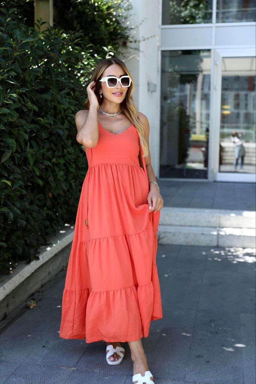 Kadın Keten Kumaş Askılı Ve Volanlı Midi Boy Elbise
